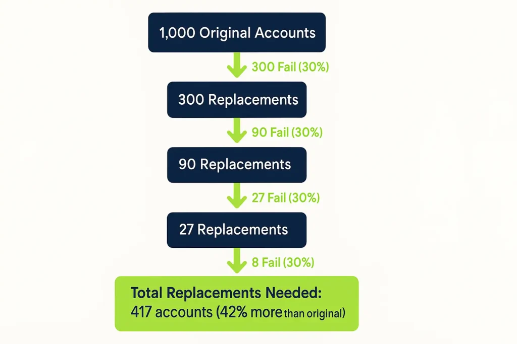 So you replace those 300 accounts. But guess what? Those replacement accounts also carry a 30% failure rate. That’s 90 more failures. Those 90 need replacements, which fail at 30%, creating 27 more failures. The cycle continues.